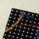 Retro 1980’s style primary colour paint strokes splatter pattern on a geometric black and white dotted background.
