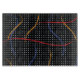 Retro 1980’s style primary colour paint strokes splatter pattern on a geometric black and white dotted background.