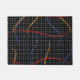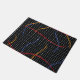 Retro 1980’s primary colour paint strokes splatter pattern on a geometric black and white dotted background.