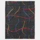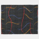 Retro 1980’s primary colour paint strokes splatter pattern on a geometric black and white dotted background.
