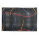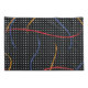 Retro 1980’s style primary colour paint strokes splatter pattern on a geometric black and white dotted background.