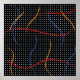Retro 1980’s style primary color paint strokes splatter pattern on a geometric black and white dotted background.
