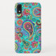 Cool retro colourful paisley pattern. Blue-green with red and yellow accents.