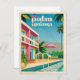 Vintage Art Deco style illustration featuring a pink and orange hotel with swimming pool against a bright blue sky with palm trees