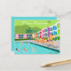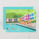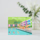 This Retro Palm Springs Hotel postcard is as fabulous as it is kitschy. Its garishly bright rainbow facade is dwarfed by the lime green mountains and spectacularly iconic palm trees. There's a party going on by the pool with bathing beauties and muscle men soaking up some vitamin D while watching the synchronised swimmers perform. It appears that only one of the swimmers knows the routine; the other four are out of sync. How embarrassing for them! The only thing that would make this design say “Palm Springs” more would be if it was written in the clouds. Oh, wait. It is!