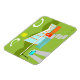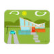 This Retro Palm Springs House with Car Flexible Magnet is a mid century modern lover’s dream. The minimalist art design features a sleek orange and glass house with a dramatically sloping checkmark shape roof. The red door offsets the orange stone planter filled with greenery and the decorative turquoise cinderblock privacy screen. Staggered concrete blocks form the perfect walkway through the lush, green lawn. A white carport offers shelter to a turquoise and white classic 1950’s car with fins. The car is perfect for driving around the green, rounded mountains in the distance. The kitschy 1960’s style house looks like a shady oasis from the hot, Palm Springs sun.