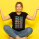 The carefully selected colours, ranging from stylish vibrant green teal, soft pinks to dynamique aqua blue, printed over a black t-shirt creating a soothing and serene aura contrasted over the dark background that resonates with the essence of Zen.