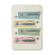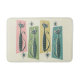 My original vector illustration of retro style patchwork tabbies and starbursts, in blue grays and pinks on hatched pink, green, yellow and blue, with an off white/tan background.