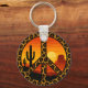 Western boho-inspired keychain featuring a bold leopard print peace sign framing a vivid desert sunset scene. The warm gradient sky fades from deep orange to golden yellow, with towering cacti silhouettes and a mesa rock formation under a glowing sun. A perfect accessory for free-spirited, Western, and retro style lovers.