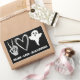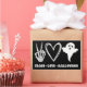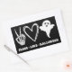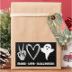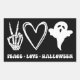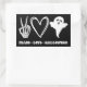 Peace Love Halloween sticker in retro letters with skeleton hand, a heart and spooky ghost.