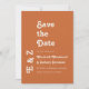 This modern retro wedding Save the Date card features off-white text on a burnt orange background. Add the names and monogram initials of the bride and groom in stylish retro display typography and the details in sans serif font. On the reverse side, replace the sample image with your own favourite photo, and add a brief text with names, date and wedding website URL, if you wish.