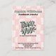 This charming jewellery display card feature a playful pink and white chequered background with retro flowers. The font is a bold vintage retro style fully customazible in the design edit tool. The back includes a warm “Thank You” message, along with space for contact details like your shop's website, email, and phone number. Perfect for presenting your handmade jewellery with style and adding a fun personal touch.