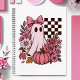 Muted blush, cream, and warm brown tones create a #nostalgicaesthetic that’s playful yet stylish. The bold chequerboard backdrop paired with the soft #cottagegoth floral details adds contrast, letting the ghost stand out with whimsical flair.
