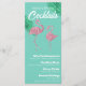 This glamourous custom cocktail menu features a retro pink flamingo theme. Two pink glitter style flamingos are placed in the centre portion. Large palm leaves are placed on either side of the "Cocktails" title and event name. A list of drinks and ingredients is printed below. The background is a beautiful teal colour with vintage style white font.