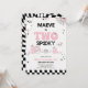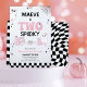 Halloween two spooky themed second birthday invitation for a girl featuring two groovy ghosts, a cobweb, spiders, stars, a cute scull, pumpkins and retro text in black and pink. This two spooky 2nd birthday invitation also features a checkerboard pattern and is ideal for an October second birthday party for a girl.