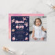 This space birthday invitation features retro 70s text, pink and purple colours and space illustrations. The illustrations are planets, stars and a rocket ship. The back is a girly pink galaxy, making this the perfect invitation to celebrate your little astronaut.