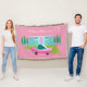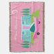 Between the pink background, turquoise mid century modern home, and the classic 1950s car, this design couldn’t be more Palm Springs if it said it in the clouds. Oh, wait, it does say it in the clouds! The blue and teal stone of the house is offset by the sputnik light fixtures framing the hot pink door. This kitschy, retro design welcomes you to live your most fabulous life.