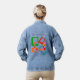 This denim jacket has a mid-century modern design of red, green, orange and plaid rounded rectangles overlapping each other. If you like different colors, message me.