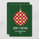 Celebrate the season with a cheerful, retro-inspired design! This stylish Christmas card features a bold, classic red and lime-green polka dot ornament hanging from a simple string against a deep hunter-green background. The clean, modern look is perfect for sending warm wishes to friends and family. Personalise the bottom with your family name and the year for a simple, festive greeting. A great choice for those who love vintage charm and traditional holiday colours with a fun, modern twist.