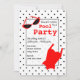 A pool party invitation featuring a background of white with small black polka dots on front and back. Red cat eye sunglasses at top left corner and red retro one piece bathing suit at bottom right. Personalise the black and red text over sheer centre section with details of your occasion.
