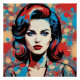 This portrait is a work of digital art in the pop art style, representing a female portrait with a retro hairstyle. The work has bright and contrasting colors, mainly red, blue and black, on an abstract background with colorful circular shapes. The style evokes the glamorous illustrations of the 50s and 60s with a contemporary touch.