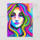 Postcard in a retro, semi abstract portrait of a woman surrounded with long hair in bright, psychedelic, rainbow colours