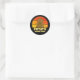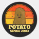 Funny Retro potato birthday sticker. This adorable , fun design features a happy brown potato with a big smile, dots for eyes and his arms sticking out to the side in front of a retro, distressed, orange, red and yellow sun. Below are templates to add whatever you want or leave as they are. The example text reads "Potato" one line and "since with date" below.