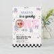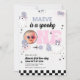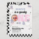 Halloween spooky one themed first birthday invitation for a baby girl featuring two groovy ghosts, a cobweb, spiders, stars, cute pumpkins and retro text in black and purple. This spooky first birthday invitation also features a checkerboard pattern and is ideal for an October first birthday party for a baby girl.