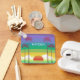 Modern colorful personalised keychain with retro style sunset and palm trees art.