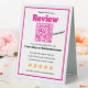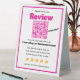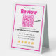 Encourage happy customers to leave feedback with this hot pink review request sign. Designed for modern branding and small business promotion, this eye-catching display features a custom QR code with a direct call to action to leave a 5-star review on platforms like Yelp or Google. Ideal for salons, pet grooming, boutiques, cafes, or studios looking to boost visibility through positive customer opinions. A stylish and effective marketing tool that makes it easy for visitors to rate your shop with just a quick scan.