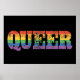 This retro gay pride image has the word "queer" in rainbow lettering with a worn texture.