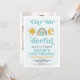 Our Mr onederful 1st birthday invitation for baby boy featuring a sun, rainbow and some retro style font text. This Mr one-derful first birthday invitation also has a light blue background and a photo on the back.