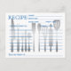 A card with blue lines, stripes placed on white surface with personalised background retro recipe on front postcard. It is customised with your initial and name.