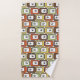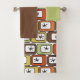 This towel set has a green washcloth, a brown hand towel, and a bath towel with a mid-century modern design of rounded rectangles in green, gold, orange, or brown with starbursts inside. If you like the design but prefer different colours, message me.