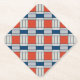 This paper coaster features a retro geometric pattern in red, blue and light grey.