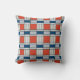 This throw pillow features a retro geometric pattern in red, blue and light grey.