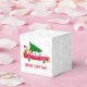 A tiny 2x2 inch favour box with a cool old red car carrying a green christmas pine tree on its roof and a present tucked away in the open trunk.