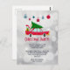 Christmas party invitation postcard with a cool old red car carrying a green christmas pine tree on its roof and a present tucked away in the open trunk.