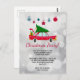 Christmas party invitation postcard with a cool old red car carrying a green christmas pine tree on its roof and a present tucked away in the open trunk.