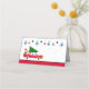 Folded place card with a cool old red car carrying a green christmas pine tree on its roof and a present tucked away in the open trunk.