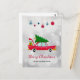 Christmas holiday postcard with a cool old red car carrying a green christmas pine tree on its roof and a present tucked away in the open trunk.