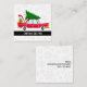 Business cards with a cool old red car carrying a green christmas pine tree on its roof and a present tucked away in the open trunk.
