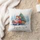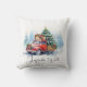 Watercolor retro red truck with Christmas pine wreaths, tree and red bows in winter forest.