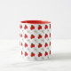 A retro coffee mug with a pattern of red strawberries and white strawberry flowers.