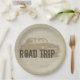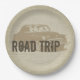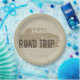 Retro sepia tint 1950s car illustration with "road trip" text in rough font on a vintage kraft paper style background
