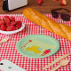 A retro looking robot standing next to a yellow car. This design looks really effective on this Paper Plates