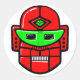 A robot head in red with a stylish green crescent shaped eye panel, a green third eye, with white teeth and highlights. He has a kind of odd sort of grin like he's discovered the wonders of some revolutionary new motor oil. From an original vector drawing by N.A. Berry.