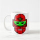 A robot head in red with a stylish green crescent shaped eye panel, a green third eye, with white teeth and highlights. He has a kind of odd sort of grin like he's discovered the wonders of some revolutionary new motor oil. From an original vector drawing by N.A. Berry.