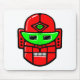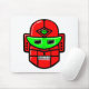 A robot head in red with a stylish green crescent shaped eye panel, a green third eye, with white teeth and highlights. He has a kind of odd sort of grin like he's discovered the wonders of some revolutionary new motor oil. From an original vector drawing by N.A. Berry.