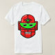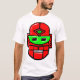 A robot head in red with a stylish green crescent shaped eye panel, a green third eye, with white teeth and highlights. He has a kind of odd sort of grin like he's discovered the wonders of some revolutionary new motor oil. From an original vector drawing by N.A. Berry. The motif is repeated on both the back and the front.